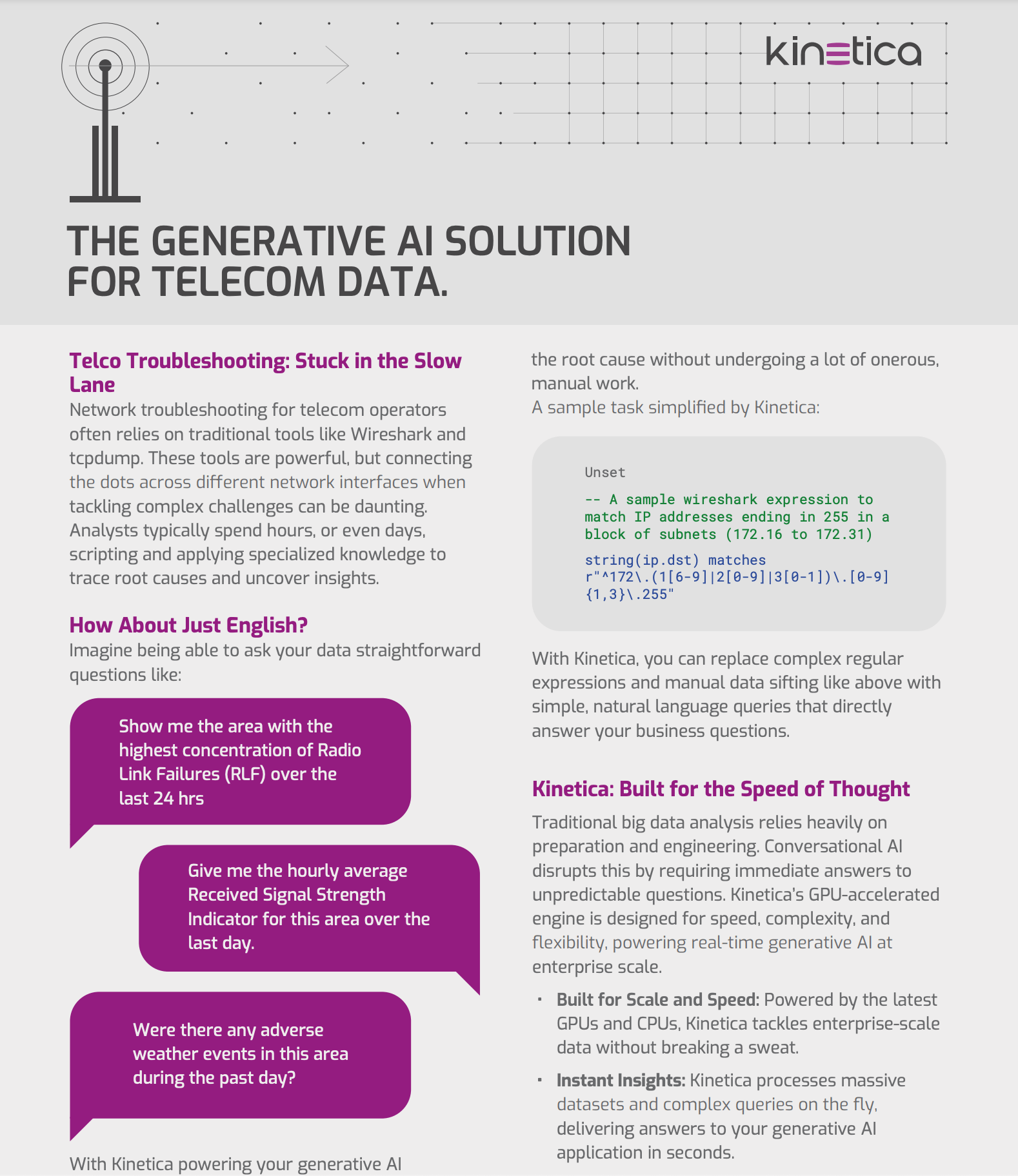 A leading U.S. telecom provider uses Kinetica to power an AI copilot, helping network engineers resolve customer issues faster. Complete the form below to request access.