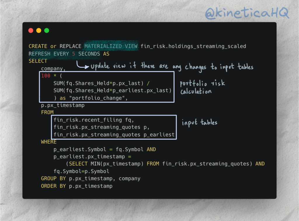 It calculates a relatively simple measure of risk by taking the ratio of the current portfolio value to the earliest available portfolio value. Any time new records are added to the input tables in this query the view gets refreshed within 5 seconds. This means that any volatility beyond acceptable thresholds will trigger an alert within 5 seconds regardless of the size and scale of the data.