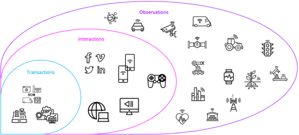 The earliest form of data used for analytics described transactions. Examples of transactions include when an order is placed, inventory is replenished, or revenue is collected. The era of big data emerged when organizations began to harness interactions data. Interactions make a record of decisions made by humans. Examples of interactions include liking something on social media, watching a show through a streaming service, browsing the web, or playing a video game. What drives data volume growth today is proliferation of devices that capture observations. Curt Monash defines it as data that is more about observing humans and machines than recording the choices of humans. For example, sensors are able to monitor our pulse, the flow of traffic at an intersection, drone traffic in the air, the temperature of mechanical part, the location of goods as they move through the supply chain, the amount of energy consumption at a building, and so on. Sensors that observe humans and machines are synonymous with the Internet of Things (IoT), as the readings are available online for processing at the edge or cloud.