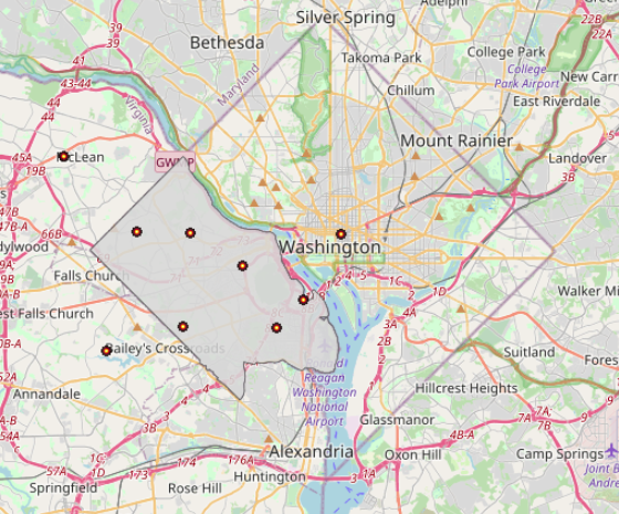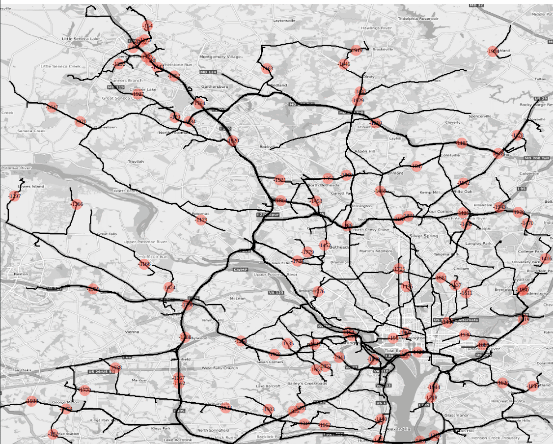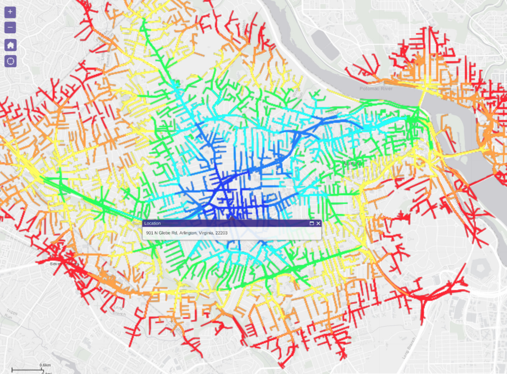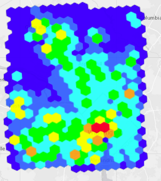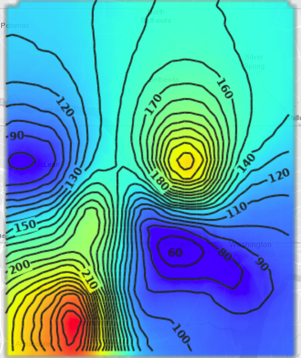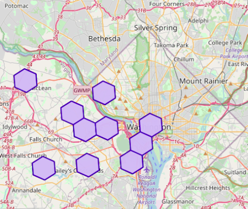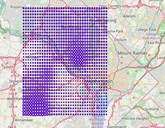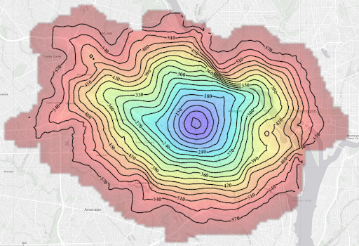 Last but not least, the isochrone visualization pattern; it is the combination of graph solve and contour interpolation. From a single source location, we find all the reachability lines (ischorones) at constant iso levels. If the weight of the graph is in time, it is truly an isochrone. Isochrones can be used finding accomodation within the optimal distance to the airports and businesses, or disaster recovery teams that can reach out within minutes to the danger zones, Kinetica provides a fast and accurate solution utilizing our in-house graph solvers. (https://docs.kinetica.com/7.1/graph_solver/network_graph_solver/) The solution is rendered as isochrone contours using Kinetica’s distributed visualization engine, and the results can also be exported as images or vector layers (WKT Polygons). Here is an example of metropolitan DC area ischrones originating from the Kinetica headquarters.