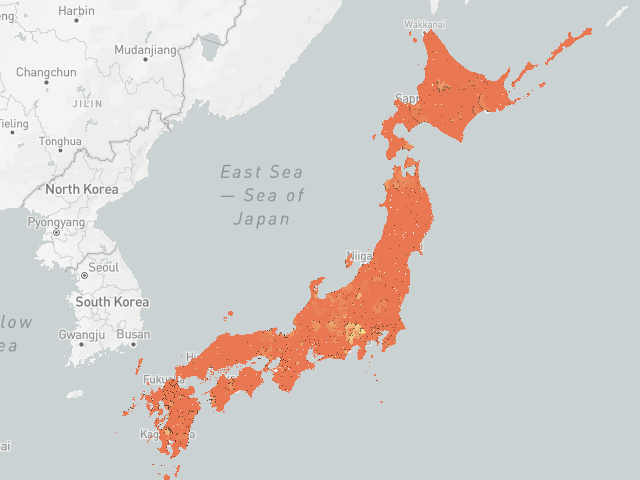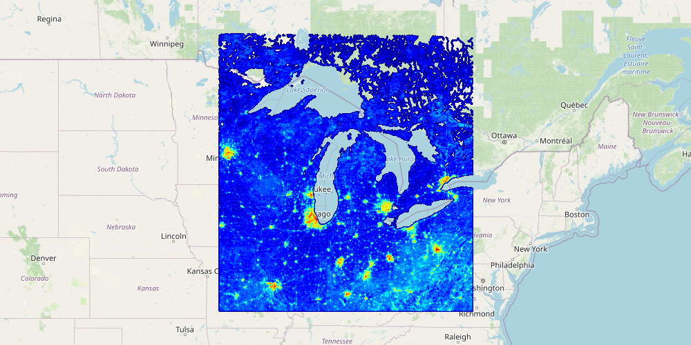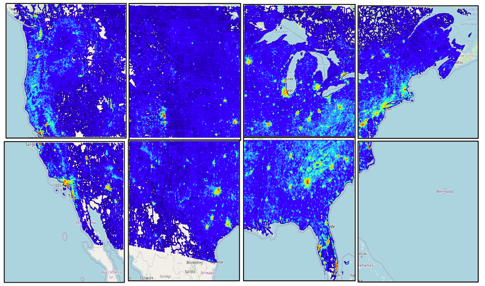 Yet another one of the most common visualization patterns is the heatmap which is our fastest form of visualization. It shows billions of records in milliseconds – showing the density of the data using convolution. The color coded heatmap is an indication for the number of records but not how those records’ scalar values imply However, it is a great way to distinguish heavily hit areas, such as looking at the entire US road network heatmap, one can quickly notice the metro-politan areas as seen below: