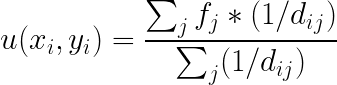 Where f_j is an existing data scalar value at (x_j,y_j), and d_{ij} are the distances from (x_j,y_j) to (x_i,y_i) location where we seek the scalar value of variable u.