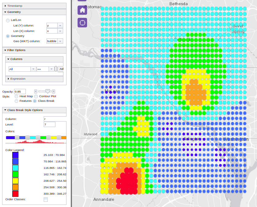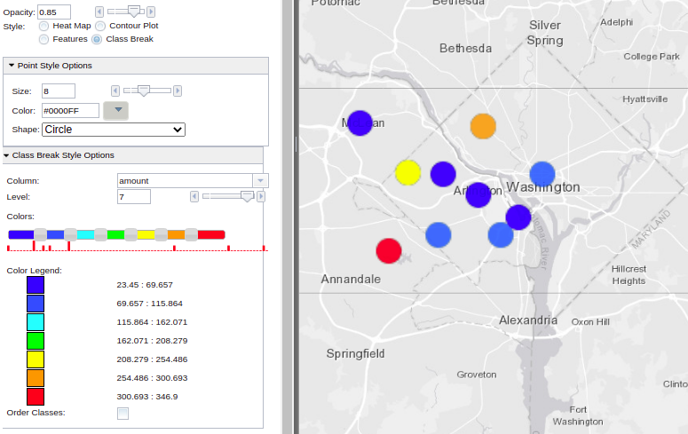 One more variation to the above visualization form could be by adding a color variation to emphasize the data spread not only with varying bubble radia but also with colors, proportional to the levels of the column ‘amount’, the scalar field variable. This is called ‘class breaking’ in our WMS call. Here is an example of applying color breaking on the ‘r’ column of the interpolated data, i.e., the ‘amount’ column in the original sales table: