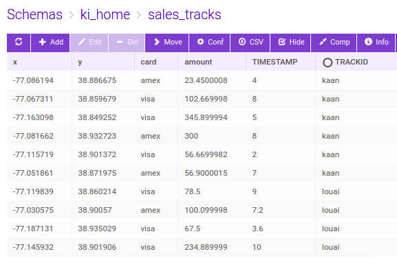 However, track lines may probably be a better candidate for temporal movement, hence creating a video out of a track visualization style makes more sense. So, if we modify our sales table with additional TRACKID and TIMESTAMP columns, we can create videos that tracks the movements of the sales transaction temporally. Here is the modified sales table: