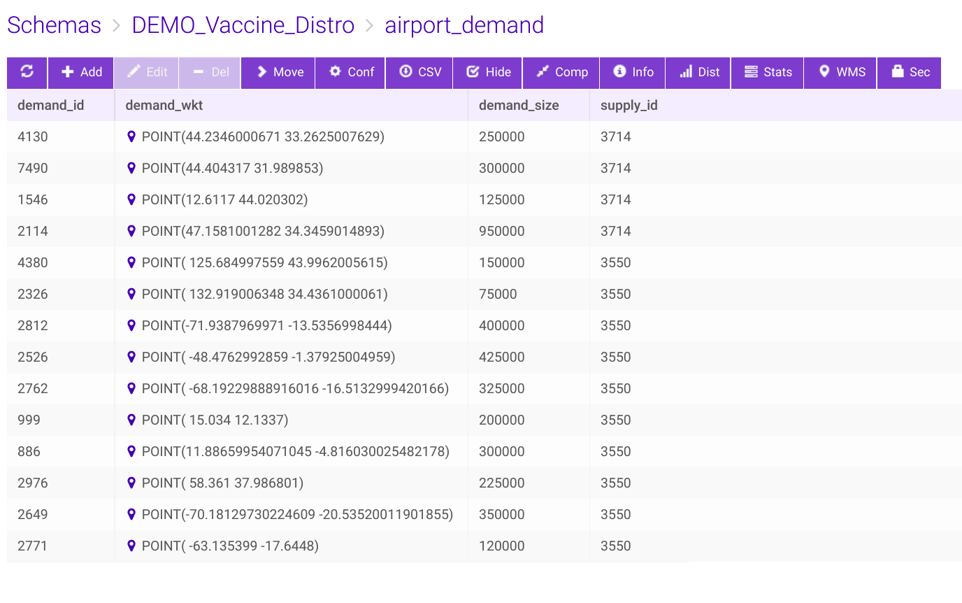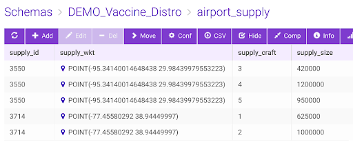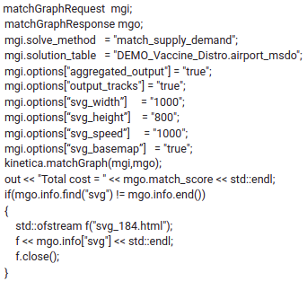 Yet another visualization form supported by Kinetica is the embedded SVG content with animations for the MSDO (multiple supply demand solver) solver. The above class break track video for the vaccination distribution can also be created directly from the solver endpoint by setting these options:
