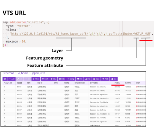 We have seen so far visualizations on the server side via WMS calls, and the concatenation of filtered views in terms of video streams, there are also client side rendering options available in Kinetica, namely, WFS and VTS (vector tile service) services. The user’s own CSS styles and rendering properties to various features in the geometry can be associated by client side rendering. The server sends geometry and attributes (map of features to geometry) in protobuf or JSON format, and the client renderer knows how to consume and display it on distributed architectures. Here is an example of that: