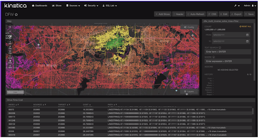 The last mention deserves to be the most frequently used visualization form, i.e., the visualization of geometrical primitives; polygons, lines, points, etc. All WKT type geometry constructs are supported by Kinetica. Our BI tool around Reveal framework consumes all these different types of visualization patterns(endpoints) in an intuitive data analysis and exploration UI tool. One million source to destination pair shortest paths are shown in class break form with colors proportional to their distances from the destination location below (https://docs.kinetica.com/7.1/analytics/reveal/):