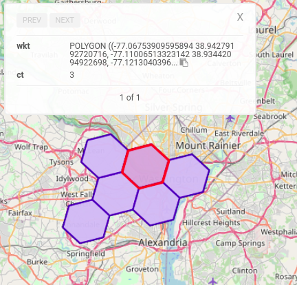 select stxy_h3(x, y, 5) as h7, count(*) as ct
