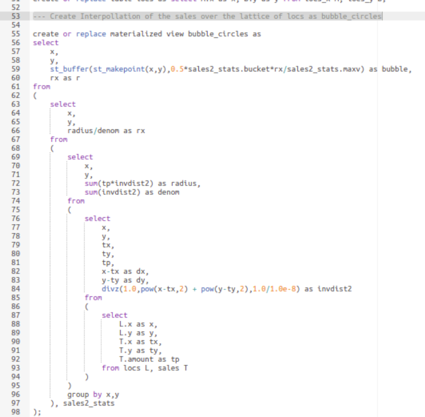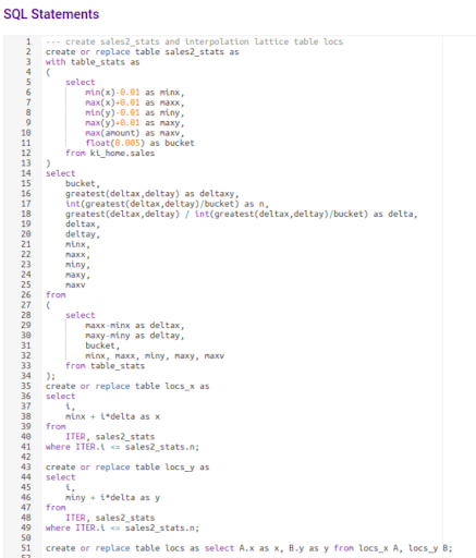 As you can see above, the bubble radius indicates how the scalar field ‘amount’ changes throughout the domain interpolated from the actual data values within the lattice of minimum and maximum range. The above interpolated data is obtained using the SQL statements depicted below; the statements can be customized by changing the name of the input table name, ‘sales’ to the user defined and the corresponding columns names, x,y, and amount to custom ones, respectively. The only other parameter used is the ‘bucket’ which is the delta for the interpolation bin (lattice) structure.