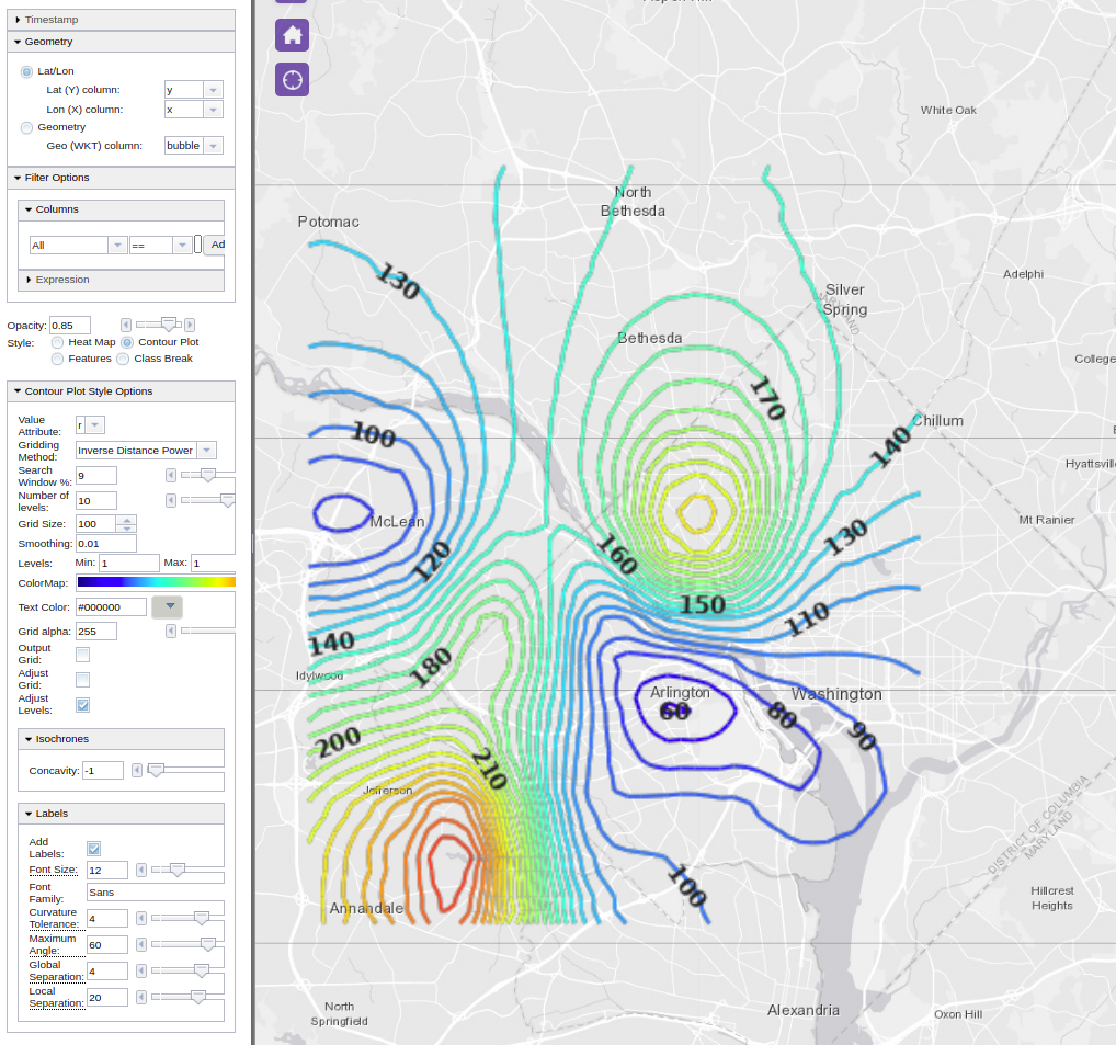 Another form of visualization is contour plots. Contours are computed the same way as we did the interpolation as above, i.e., using the inverse distance weighted averaging method. However, the performance of finding the iso-lines corresponding to a specific level of the ‘amount’ column, i.e., the scalar value depends on the number of existing data points used per lattice corner interpolation. The concept of search radius is used for limiting the interpolating template (window) to a number of adjacent layers around the interpolated corner.