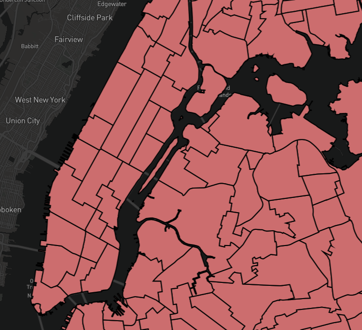 Polygons are a series of connected coordinates that are closed — when the first and last coordinate are the same. Polygons can have holes in them as well. Polygons represent real-world boundaries, like state borders, voting districts, or even the outline of a facility. Polygons are often used to generalize granular data, like points, to make maps easier to read and understand. Polygons can also take more complex forms, like MultiPolygons, where several polygons are contained in a single record.