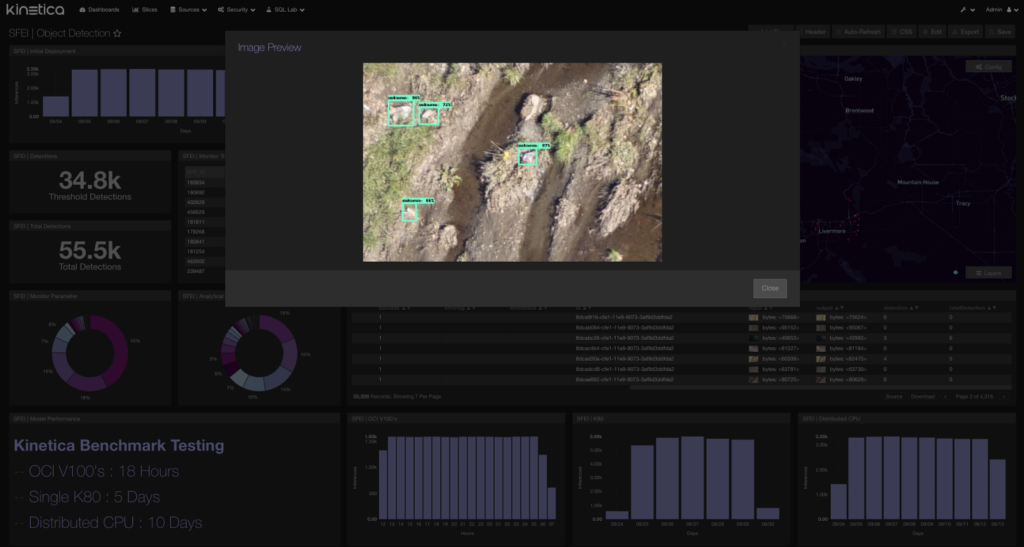 SFEI provided months worth of drone data amounting to an image set of over 30k images of the Bay Area. Each iteration of testing was deployed in continuous mode. In their environment and existing infrastructure, they were able to analyze these images in roughly 17 days. Using distributed CPU, we churned through the image set in 10 days. This was a nice performance kick from Kinetica’s push-button model replication functionality but using GPU is where the real performance came into play. On a single GPU we brought the inference time down to 5 days. For the final test harness, our partners at Oracle provisioned us with an 8 GPU machine on Oracle Cloud Infrastructure. We distributed the workload across all 8 GPUs and ran the same test against the same image set. The inference completed in 18 hours and 26 minutes, resulting in a roughly 2200% increase in performance. That translates to ~2.2 seconds per image. Streaming object detection from drone images is now a scalable solution. Moving forward SFEI can implement multiple drones to cover more areas along the coast to expand the scope of the project. With Kinetica’s linear scalability, and the versatility of scaling with Oracle Cloud Infrastructure, this project will seamlessly expand.