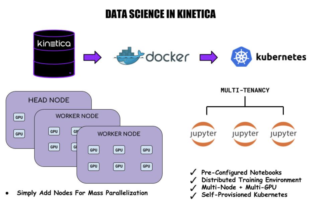 - Development: Kinetica is agnostic to the languages or libraries used to build these machine learning or deep learning models. There are tools to deploy these algorithms whether a data scientist wants to use R, Python, Spark, RAPIDS, etc. Data scientists can train and adjust their models in pre-configured Jupyter notebooks, natively in Kinetica, or, work in independent IDEs of their choice.