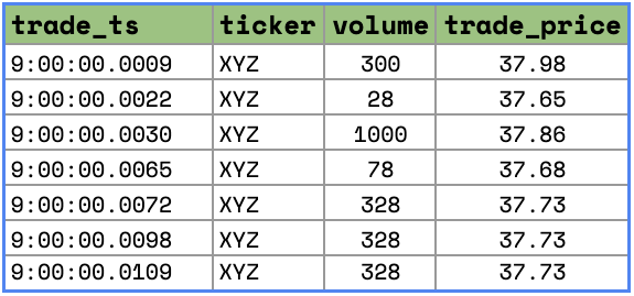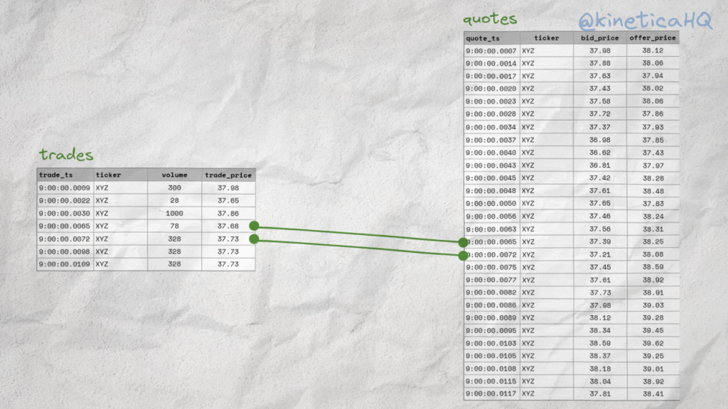 This is particularly true when dealing with streaming data. For instance, imagine that you have two tables. A trades table showing the time at which different trades for a particular stock were executed and another with the quotes. Both these tables are recorded with a timestamp with millisecond intervals.
