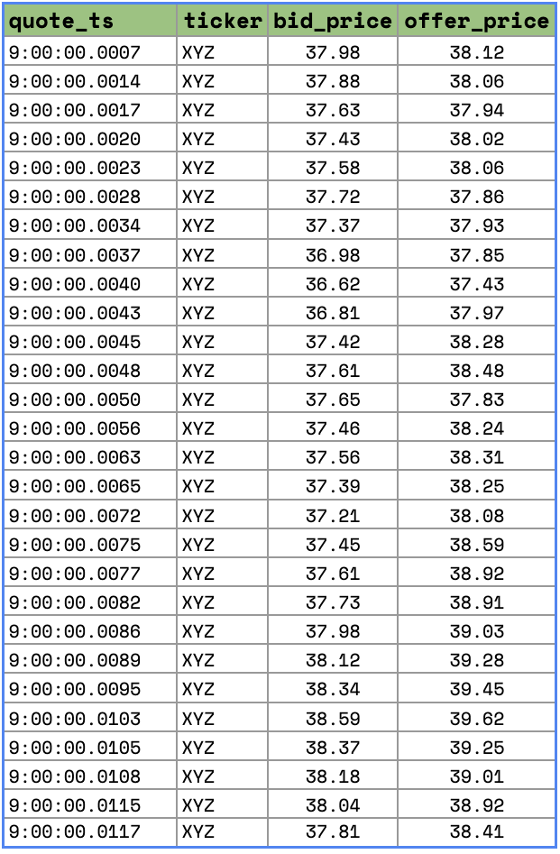 With an equality based join we miss out on a ton of information. There are values in the quotes table that are within a millisecond from records in the trades table. But we have simply skipped these because they weren’t exact matches, ending up with a pretty sparse output.