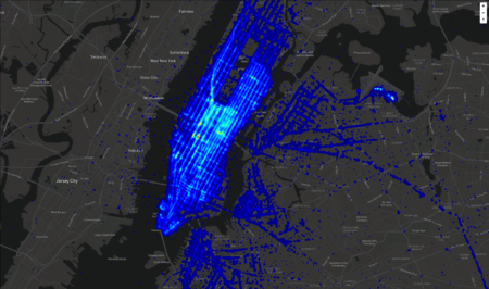 But geospatial data stored in Kinetica can be rendered in-database, into a small WMS image layers, for display on top of basemaps with ArcGIS. This approach is blazing fast, even on massive datasets. With every pan and zoom on the map, Kinetica dynamically re-renders images using your live data source and sends them to the map.