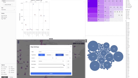 By using the extension in conjunction with Kinetica’s JDBC connector, you can accelerate your entire BI experience. You’ll be able to create stunning dashboards with all of your favorite Tableau charts, backed by massive data sets, with geospatial data now included. As you apply filters in your dashboard, the map instantly updates to reflect changes on the fly. Kinetica takes care of creating the views for you under the hood, giving you real-time interactivity when slicing and dicing huge data sets.