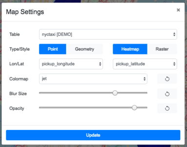 Kinetica Geospatial Visualization for Tableau gives you the ability to customize the way your geospatial data is displayed. You can choose from two rendering modes: Heatmap and Raster. In Heatmap mode, geospatial data is displayed in terms of its density on the map. In Raster mode, each point or polygon is given a solid color, so you can see each and every individual shape on the map. Changing the color, the blur, and other visualization parameters is easy —  you use only dropdowns and sliders to change the look and feel. If your data has multiple columns with geospatial data in it, you can easily switch between them as needed.