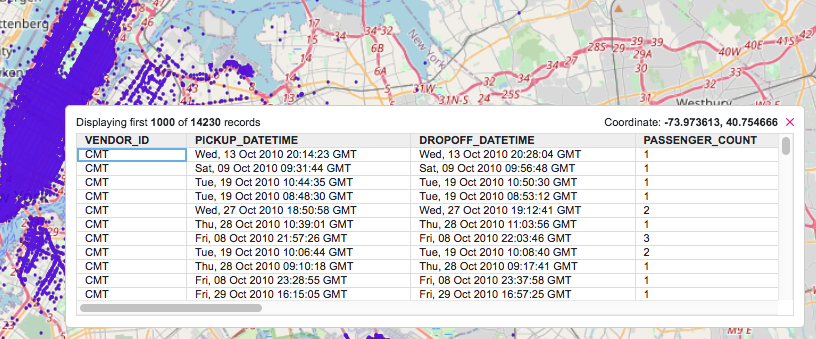 Drilling into map data is easy too. Simply click anywhere on the map, and see a tabular view of all the data near your point of interest. The extension will automatically paginate the results, so you get a snappy response and a reasonable amount of data returned for you to explore.